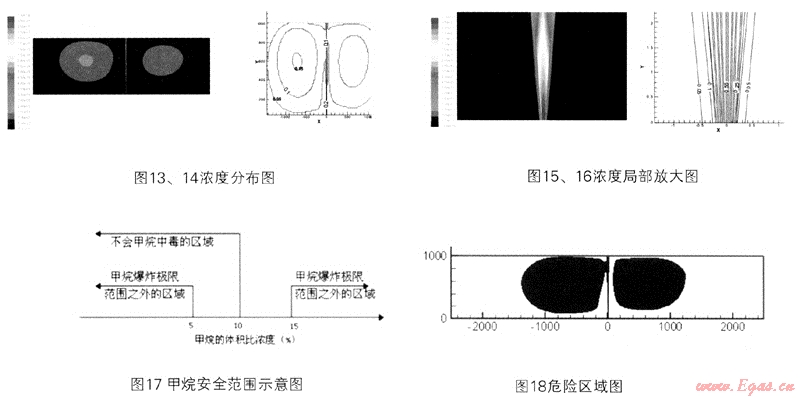 圖22、圖23和圖24是各自情況下的危險(xiǎn)區(qū)域的圖,圖中紅色的部分表示甲烷的濃度處于爆炸極限范圍內(nèi),是有爆炸危險(xiǎn)的區(qū)域。