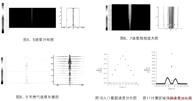由圖8和圖9還可以看出,天然氣離開孔口以后其速度并非立刻減小,而是先增大到一個(gè)最大值后再逐漸減少的。這是因?yàn)椋瑯?biāo)準(zhǔn)狀態(tài)下天然氣的密度小于空氣的密度,即該射流為正浮力射流。對(duì)于正浮力射流,由于浮力作用,其流速將沿程增加,直到射流核末端,混合區(qū)已擴(kuò)展到射流的軸線上,環(huán)境流體的減速作用已經(jīng)影響到了整個(gè)射流,故其流速又開始減小。正浮力射流的射流核末端恰恰位于最大軸向流速處。