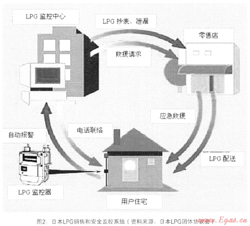 在安全管理方面,經(jīng)營(yíng)者在用戶處設(shè)置安全監(jiān)控系統(tǒng),并與用戶信息管理系統(tǒng)整合為一體,通過信息監(jiān)控中心可以隨時(shí)掌握用戶的安全和用氣情況。根據(jù)日本LPG團(tuán)體協(xié)議會(huì)所提供的資料,用戶安全監(jiān)控系統(tǒng)自上世紀(jì)80年代中期開始推廣,到90年代中期普及率基本達(dá)到100%,LPG用戶事故也從500起/年以上下降到100起/年左右,顯著提高了LPG使用的安全性。