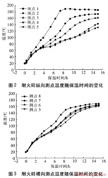 干燥窯內(nèi)耐火磚縱向測(cè)點(diǎn)和橫向測(cè)點(diǎn)的溫度隨保溫時(shí)間的變化分別見圖2和圖3。