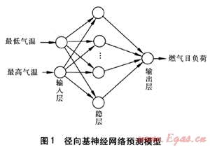 徑向基神經(jīng)網(wǎng)絡(luò)[2]是一種兩層前向型神經(jīng)網(wǎng)絡(luò),包含一個(gè)具有徑向基函數(shù)神經(jīng)元的隱層和一個(gè)具有線性神經(jīng)元的輸出層。在燃?xì)舛唐谪?fù)荷預(yù)測領(lǐng)域中,它以訓(xùn)練速度快、學(xué)習(xí)精度高的優(yōu)點(diǎn)開始逐漸嶄露頭角。考慮到燃?xì)馊肇?fù)荷受天氣狀況影響比較大,筆者以網(wǎng)絡(luò)的輸入為最低氣溫、最高氣溫,輸出為燃?xì)馊肇?fù)荷建立徑向基神經(jīng)網(wǎng)絡(luò)預(yù)測模型(見圖1)。