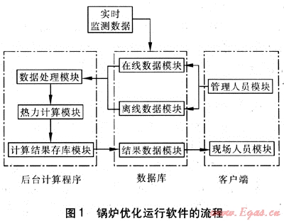 鍋爐優(yōu)化運(yùn)行軟件的核心功能在于利用監(jiān)測(cè)數(shù)據(jù)通過(guò)對(duì)鍋爐運(yùn)行可調(diào)參數(shù)的控制使鍋爐實(shí)現(xiàn)安全經(jīng)濟(jì)運(yùn)行。鍋爐優(yōu)化運(yùn)行軟件基于B/S模式(瀏覽器/服務(wù)器模式,即用戶工作界面通過(guò)IE瀏覽器來(lái)實(shí)現(xiàn))的Web網(wǎng)絡(luò)數(shù)據(jù)庫(kù)應(yīng)用系統(tǒng),可以在線顯示鍋爐受熱面的壁溫?cái)?shù)據(jù)、污染物數(shù)據(jù)等,可指導(dǎo)現(xiàn)場(chǎng)人員操作。數(shù)據(jù)庫(kù)采用SQL Server2000,后臺(tái)計(jì)算程序采用Visual C++語(yǔ)言編寫,結(jié)合在線監(jiān)測(cè)數(shù)據(jù)進(jìn)行鍋爐運(yùn)行調(diào)節(jié)[3]。鍋爐優(yōu)化運(yùn)行軟件的流程見(jiàn)圖1。
