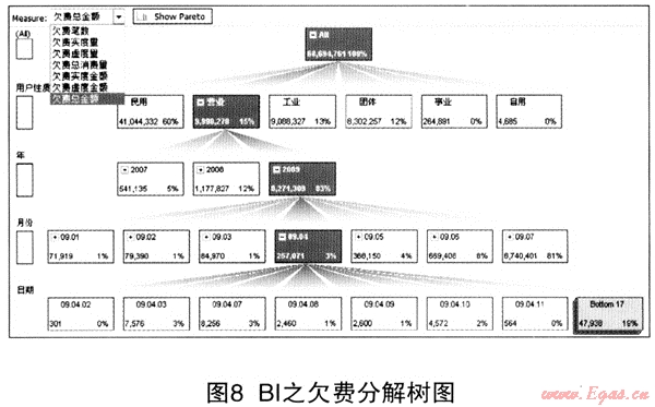 傳統(tǒng)的報(bào)表多以行列分布,很難實(shí)現(xiàn)數(shù)據(jù)層層展示,GDIA系統(tǒng)利用BI技術(shù)突破了傳統(tǒng)報(bào)表的框架。如圖8欠費(fèi)分解樹為例,以用戶性質(zhì)作為第一層、年份作為第二層、月份作為第三層、日期作為第四層,不僅將欠費(fèi)情況分解到不同的用戶性質(zhì),直觀的展現(xiàn)出欠費(fèi)用戶的結(jié)構(gòu),同時(shí)還根據(jù)不同的年份、月份、日期讓管理者清晰的了解不同用戶性質(zhì)欠費(fèi)年趨勢、月趨勢、年對(duì)比、月對(duì)比,便于管理者及時(shí)調(diào)整對(duì)策,增強(qiáng)欠款催討管理力度。