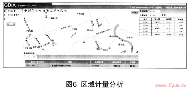 在GIS地理圖層上標(biāo)定區(qū)域流量計(jì),通過GDIA系統(tǒng)將兩數(shù)據(jù)源的數(shù)據(jù)進(jìn)行整合,將《SCACA系統(tǒng)》流量計(jì)測點(diǎn)數(shù)與《客戶信息管理系統(tǒng)》中該區(qū)域用戶賬本信息配對(duì)綁定,清晰的反映抄表月份區(qū)域內(nèi)購入與實(shí)際銷售量的差異,高效地獲取區(qū)域產(chǎn)銷差的準(zhǔn)確數(shù)據(jù),擺脫以往手工摘錄事后拼揍的統(tǒng)計(jì)方式,為職能部門與管理者提供區(qū)域產(chǎn)銷差分析基礎(chǔ)數(shù)據(jù)(見圖6)。