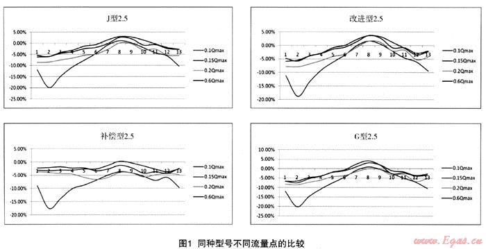 (1) 選取典型表,經(jīng)過模擬不同流量點(diǎn)運(yùn)行后,各表的計(jì)量特性有無變化及特點(diǎn)。