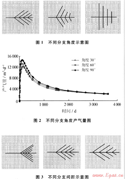 設(shè)定分支與主支的夾角均為30°,單側(cè)分支長(zhǎng)度分別為200、300、400m和500m,改變分支間距分別為100、200m和300m(圖3),研究不同分支間距對(duì)產(chǎn)氣量的影響。