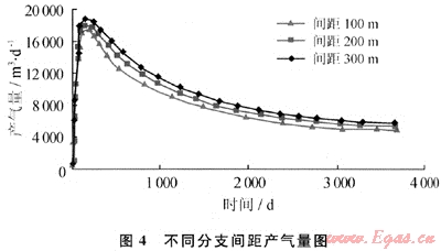 從圖4可以看出,當(dāng)分支間距增加時(shí),產(chǎn)氣速度不斷增加,但隨著分支間距的增大,產(chǎn)氣量的增幅變小。究其原因是因?yàn)榉种чg距的太小,控制泄流面積小,峰值產(chǎn)氣量就?。环种чg距變大,控制面積也隨之變大,形成大面積同時(shí)排水降壓,產(chǎn)氣量增加。但是多分支井的有效控制面積有一個(gè)極限值,分支間距太大時(shí),分支變?yōu)閱蝹€(gè)的井筒控制煤層滲流,達(dá)到最大有效控制面積,產(chǎn)氣量也達(dá)到最大值,再增加間距,已經(jīng)不能增加有效控制面積,也不能控制相應(yīng)煤層區(qū)域的采出程度。所以對(duì)于給定的煤層氣藏,存在一個(gè)最優(yōu)的分支間距,既能保證較大的控制面積,又能保證分支間的互相影響,有效的控制煤儲(chǔ)層,獲取較高的采收率。