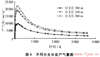 從圖6可以看出,隨著分支長(zhǎng)度的增加,產(chǎn)氣量和峰值產(chǎn)氣量都在增加,但是考慮到煤層邊界和井筒壓降的影響,分支長(zhǎng)度也應(yīng)該有一個(gè)比較合理的值。