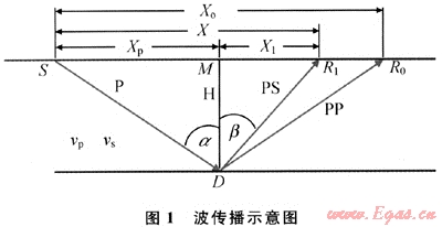 波場(chǎng)的反射與轉(zhuǎn)換是同時(shí)發(fā)生的,于共反射點(diǎn)處有一組不同偏移距縱波產(chǎn)生時(shí)相應(yīng)有一組共轉(zhuǎn)換橫波與之相伴而生??v波和轉(zhuǎn)換橫波同時(shí)向上傳播,到達(dá)地面后被儀器記錄下來(lái)。圖1為波的傳播路徑示意圖[2~5,8],界面深度為h,S為震源,由震源產(chǎn)生的下行P波遇到界面后,產(chǎn)生反射P波(P-P波)的同時(shí),又轉(zhuǎn)換形成反射SV波(P-SV波),然后上行傳播到地面(圖1)。其中,R0是P-P波地面接收點(diǎn),R1是P-SV波地面接收點(diǎn),D是界面反射點(diǎn)位置,M是地面共中心點(diǎn)位置。