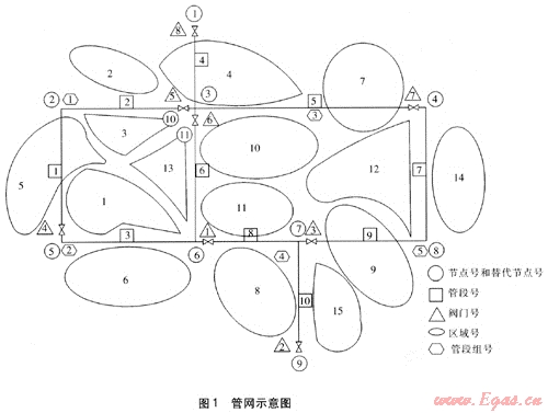 本文討論對有一定閥門配置的管網(wǎng)[2],建立故障管段隔離決策算法,包括故障管段(或閥門)隔離矩陣以及故障管段(或閥門)隔離影響區(qū)矩陣,基于它們,在指出故障管段(或閥門)時,迅速確定應關閉的相關閥門,并給出受影響的供氣區(qū)域的報告。