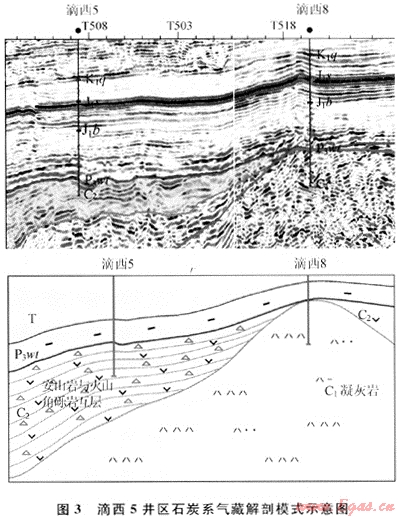 2006年通過(guò)井震結(jié)合對(duì)滴西5井區(qū)進(jìn)行了解剖,從巖性巖相變化模式確定滴西5和滴西8井區(qū)石炭系為不同的巖相巖體,認(rèn)為滴西5井以火山角礫巖為儲(chǔ)層,以安山巖為隔層,氣藏類型為受火山巖(角礫巖)巖性控制的層狀地層氣藏,而不是以前認(rèn)識(shí)的構(gòu)造氣藏(圖3)。