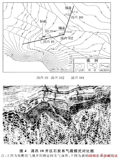 2) 滴西10井區(qū)。滴西10井鉆于2003年,石炭系巖性為流紋巖,2004年在石炭系試氣2層均獲得高產(chǎn)工業(yè)氣流。按照頂面構(gòu)造控藏模式,2004、2005年分別鉆探滴101井和滴102井2口評(píng)價(jià)井,石炭系巖性均為凝灰?guī)r,無(wú)油氣顯示。2005年底,按斷鼻構(gòu)造氣藏圈定滴西10井井控面積4.74km2(圖4中的上圖),探明天然氣地質(zhì)儲(chǔ)量20.20×108m3。2006年,對(duì)滴西10井區(qū)按巖性圈閉模式進(jìn)行了重新解釋,提出了新的氣藏模式(圖4中的下圖),并對(duì)滴102井進(jìn)行了加深鉆探以驗(yàn)證新模式。滴102井于3310m開(kāi)始加深,3460m完鉆,至3340~3370m井段鉆遇流紋巖與滴西10井出氣段巖性一致。鉆探結(jié)果證實(shí)了新模式的正確性,指導(dǎo)了后續(xù)探井的部署。2008年,按照巖性巖相控藏模式,鉆探了滴103井和滴104井,均獲得成功,新增含氣面積13.57km2,新增探明天然氣地質(zhì)儲(chǔ)量83.07×108m3。