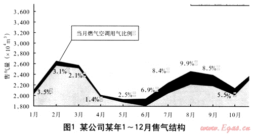 圖1為某燃?xì)夤灸衬晔蹥饨Y(jié)構(gòu),從圖中看出夏季7~9月,燃?xì)饪照{(diào)用氣占公司用氣比例的平均數(shù)為9%,為調(diào)整燃?xì)馄髽I(yè)售氣冬夏峰谷比貢獻(xiàn)近十分之一。