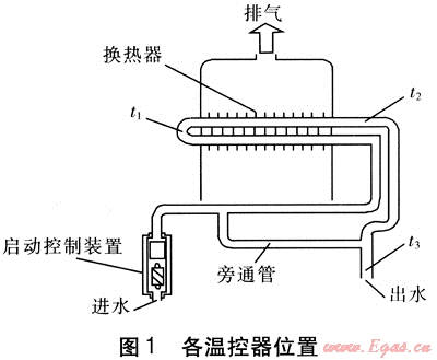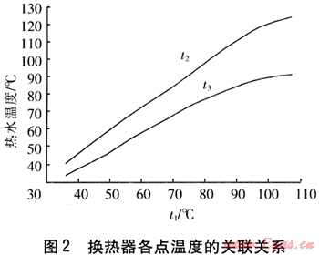 一般溫控器的設置位置從水路系統(tǒng)上考慮總是在換熱器換熱管的中端、換熱器換熱管末端、熱水器出水處(見圖1)。該3處溫度(以下簡稱中端t1、末端t2和出水t3)之間存在著關聯(lián)性。