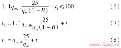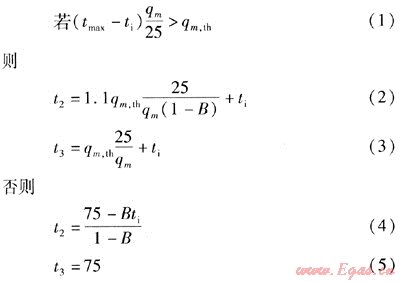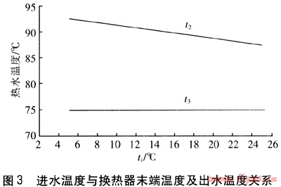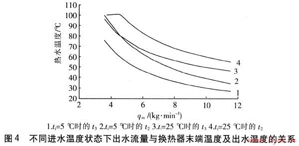 依據(jù)上述的計算公式對各狀態(tài)(如出水流量變化)分析可得出正常使用的溫度范圍為t2<92.5℃,t3<75℃。再依據(jù)圖2可推算出t1<75.5℃。