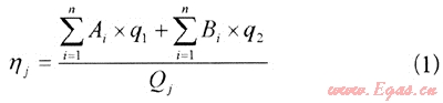 單個加氣站的日加氣負(fù)荷率:某個加氣站日負(fù)荷率(ηj)是指該加氣站售氣量與該加氣站供氣能力(Qj)的比值,該加氣站的售氣總量等于當(dāng)日所有汽車加氣量的總和。q1、q2分別是公交車與出租車的日平均加氣量。