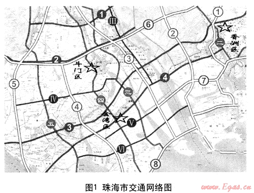 珠海市位于珠江口西南部,緊鄰澳門特別行政區(qū),是我國早期設(shè)立的經(jīng)濟特區(qū)之一。設(shè)香洲區(qū)、斗門區(qū)、金灣區(qū)三個市轄區(qū),總?cè)丝?50~350萬人?,F(xiàn)階段,珠海市只有單一的公路運輸交通模式。如圖1珠海市交通網(wǎng)絡(luò)圖所示,珠海市由5縱4橫共9條主干道,6條加密線及8條城際高速公路組成的交通系統(tǒng)。車流輛呈3個圈的片區(qū)狀布置,片區(qū)之間為30~60min車程,并呈現(xiàn)香洲區(qū)強,其他兩市轄區(qū)弱(其他兩市轄區(qū)之和遠(yuǎn)小于香洲區(qū))??梢?,加氣站的重點、難點應(yīng)放在香洲區(qū)加氣站的網(wǎng)絡(luò)布置。結(jié)合珠海市交通現(xiàn)狀,加氣站投建初期會呈現(xiàn)香洲區(qū)數(shù)目多、規(guī)模較大,其他兩市轄區(qū)較少的分布格局。