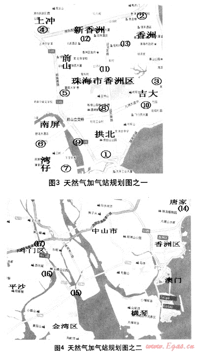 圖3中13座氣化站密集分布在香洲區(qū)內(nèi),各加氣站間距根據(jù)供氣需求均衡布置,控制車輛空載加氣距離在3km之內(nèi)。圖4中共4座加氣站,其中唐家一座,斗門區(qū)、金灣區(qū)共3座,由于用氣車源較少,控制范圍較大,加氣站應(yīng)布置在主干道交匯車流較多處(如湖心路口、尖峰山等)。圖中加氣站位置為規(guī)劃點,詳細(xì)定點與國土部門進(jìn)行深化。