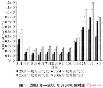 西安市2006年冬季在氣溫較高、幾乎沒(méi)有出現(xiàn)降雪的情況下,總用氣增量比前兩年明顯減少。影響用氣量變化的因素有:天氣變化、用戶規(guī)模和結(jié)構(gòu)的變化、節(jié)假日、人們的生活習(xí)慣等。