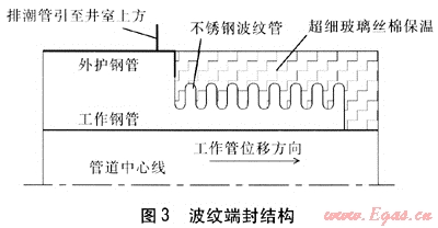 內(nèi)外管之間設(shè)波紋端封。為避免事故狀態(tài)下井室進(jìn)水導(dǎo)致保溫層進(jìn)水,需將內(nèi)外管之間封閉。但內(nèi)外管相對(duì)位移較大,封閉裝置采用不銹鋼波紋端封形式,波紋端封補(bǔ)償量按內(nèi)外管相對(duì)位移選取,經(jīng)計(jì)算波紋端封補(bǔ)償量為1050mm。這樣有效地解決了保溫層進(jìn)水及內(nèi)外管相對(duì)位移的問題。波紋端封結(jié)構(gòu)見圖3。