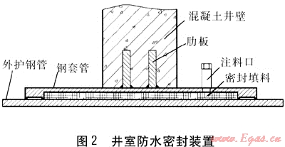 管道穿井室采用井室防水密封裝置,DN 600mm管道外管的外徑為1020mm,外管計(jì)算熱伸長(zhǎng)為185mm,如果外管與井壁采用止水環(huán)剛性連接,限制外管的位移,則外管對(duì)井室的推力將達(dá)到6200kN。采用傳統(tǒng)的柔性密封方式可靠性較差。解決這一問題的方法有兩個(gè):①外管加裝波紋管補(bǔ)償器,但又存在波紋管補(bǔ)償器長(zhǎng)期浸于水中檢修、維護(hù)問題。②外管與井壁連接處采用防水性能較為可靠的井室防水密封裝置,此裝置結(jié)構(gòu)與套筒補(bǔ)償器結(jié)構(gòu)相似,確保了井室整體的防水性。經(jīng)研究,在此工程中采用了井室防水密封裝置,通過專用注料器把密封填料通過注料口壓進(jìn)填料空腔,這樣在保證外管自由伸縮的同時(shí)也阻止水滲漏入井室。井室防水密封裝置見圖2。