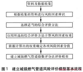 對城鎮(zhèn)燃?xì)夤艿肋M(jìn)行風(fēng)險(xiǎn)評價(jià),就是建立一套科學(xué)的評價(jià)體系,通過科學(xué)的評價(jià)方法獲得管道綜合的風(fēng)險(xiǎn)指標(biāo),這一指標(biāo)應(yīng)能客觀地描述特定的燃?xì)夤艿赖娘L(fēng)險(xiǎn)狀況。在現(xiàn)階段城鎮(zhèn)燃?xì)怙L(fēng)險(xiǎn)評價(jià)技術(shù)方法中,普遍采用的是指數(shù)評分法。應(yīng)用指數(shù)評分法建立城鎮(zhèn)燃?xì)夤艿里L(fēng)險(xiǎn)評價(jià)模型基本流程見圖1。