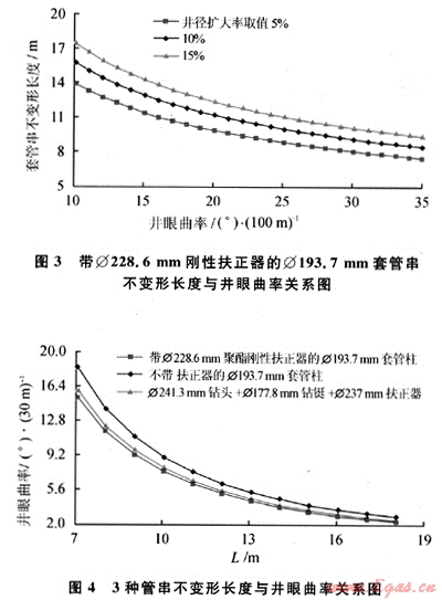 由于實(shí)測(cè)井徑不準(zhǔn)確,按井徑擴(kuò)大率5%、10%和15%對(duì)帶Ø228.6mm剛性扶正器的Ø193.7mm套管柱反算允許通過(guò)的套管串不變形長(zhǎng)度(見圖3),按井徑擴(kuò)大率10%對(duì)3種不同管串剛度進(jìn)行模擬,即計(jì)算不變形長(zhǎng)度與井眼曲率關(guān)系(見圖4)。