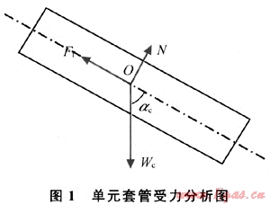 在大斜度井中,對(duì)斜井段常規(guī)下入法套管單元受力分析(見圖1),下套管作業(yè)時(shí)井口載荷為[6]: