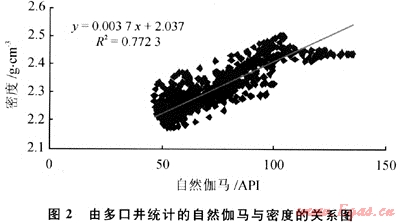 對未擴(kuò)徑處的自然伽馬與密度進(jìn)行相關(guān)分析,根據(jù)圖2的關(guān)系式,通過自然伽馬求取密度值。