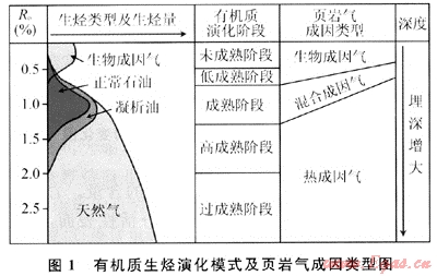 與常規(guī)油氣藏的成藏條件不同,頁(yè)巖氣來源由生物成因氣和熱成因氣組成,吸附氣和游離氣并存,具有自生自儲(chǔ)(或短距離運(yùn)移)的特征。因此頁(yè)巖氣聚集受埋藏深度、有機(jī)質(zhì)的成熟度及輸導(dǎo)、封蓋條件制約較小。埋藏較淺、有機(jī)質(zhì)成熟度低的區(qū)段發(fā)育生物成因的頁(yè)巖氣;埋藏深、有機(jī)質(zhì)成熟度高的區(qū)段發(fā)育熱成因的頁(yè)巖氣;埋藏深度和有機(jī)質(zhì)成熟度中等偏低的區(qū)段發(fā)育混合成因的頁(yè)巖氣(圖1)。美國(guó)第一口頁(yè)巖氣發(fā)現(xiàn)井深度最淺,還不足10m,而Haynesville頁(yè)巖氣聚集最大深度則近4000m;Antrim頁(yè)巖氣的有機(jī)質(zhì)成熟度(Ro)僅為0.4%~0.6%,Lewis頁(yè)巖氣的Ro則為1.6%~1.9%,頁(yè)巖氣聚集的Ro最大可達(dá)3%[24~33]。