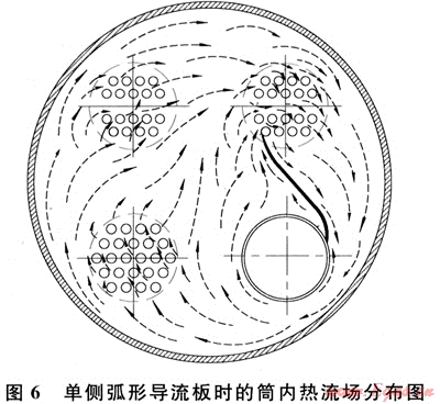 導(dǎo)流板的設(shè)置,合理分隔加熱爐加熱和冷卻受熱面之間的流動(dòng)區(qū)域,中間載熱介質(zhì)在吸收筒體下方火筒和煙管束內(nèi)的熱量后,沿著導(dǎo)流板的方向形成均勻順暢有組織的向上流動(dòng),然后將熱量傳遞給上方的對(duì)流管束,加熱低溫天然氣。中間載熱介質(zhì)放熱后,沿導(dǎo)流板另一側(cè)向下流動(dòng),形成循環(huán)均勻的流場(chǎng)。在火筒和對(duì)流管束之間加裝弧形導(dǎo)流板,導(dǎo)流板擋住了火筒與輸入對(duì)流管束之間的通道,使火筒周圍的載熱介質(zhì)向煙管束上方流動(dòng),與煙管束周圍的載熱介質(zhì)一起向上依次流經(jīng)對(duì)流管束各流程放熱后,向下回流到火筒周圍,在大筒體內(nèi)形成了整體大循環(huán)流場(chǎng)(圖6)?;⌒螌?dǎo)流板與熱流場(chǎng)的流線更貼切,能使大筒體內(nèi)的流場(chǎng)更順暢均勻,傳熱效果更好。