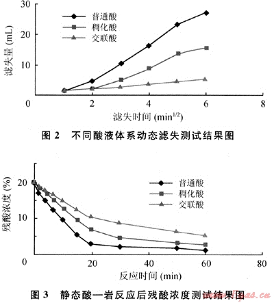 針對(duì)普通酸、稠化酸、交聯(lián)酸三種酸液體系分別進(jìn)行了反應(yīng)動(dòng)力學(xué)行為測(cè)試、酸液濾失性測(cè)試及60℃恒溫水浴靜態(tài)酸-巖反應(yīng)測(cè)試,結(jié)果表明(見表1及圖2、3):氫離子傳質(zhì)系數(shù)越低,反應(yīng)速率越慢,則酸液控濾失效果越好(濾失量越少),酸-巖反應(yīng)后的殘酸濃度就越高。文中交聯(lián)酸酸液體系顯示了良好的控濾失性能。