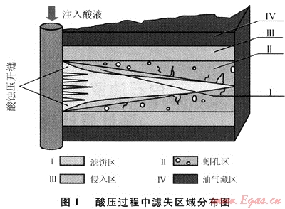 由于蚓孔地層的濾失,降低了酸液實(shí)際有效作用距離,增加的注液量?jī)H對(duì)近井帶的儲(chǔ)層改造,最終導(dǎo)致增產(chǎn)效果不理想。因此,實(shí)際酸壓過程中酸液的濾失主要包括裂縫壁面向基質(zhì)的濾失和酸蝕蚓孔濾失兩部分[6],并且細(xì)分為4個(gè)區(qū)域(圖1)。其中,酸液濾失主要受到蚓孔區(qū)(Ⅱ)內(nèi)蚓孔擴(kuò)展速度及侵入?yún)^(qū)(Ⅲ)內(nèi)與流動(dòng)剪切及裂縫溫度有關(guān)的酸液黏度所控制。另外,地層一旦形成蚓孔,酸液濾失則主要在蚓孔內(nèi)發(fā)生,濾失量由蚓孔擴(kuò)展體積和酸液向酸蝕螞孔壁面濾失量共同決定。