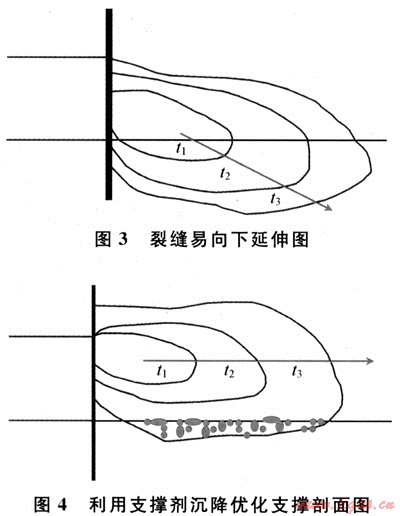 通過使用沉式隔離劑在裂縫底部形成壓實(shí)的低滲透區(qū),阻止裂縫向下延伸。可通過線性膠攜帶小粒徑陶粒,進(jìn)裂縫后停泵沉降到縫底,起到控制裂縫高度向下過度延伸的作用。圖3、4為裂縫易向下延伸情況,通過采取前置液支撐劑停泵沉降可以實(shí)現(xiàn)合理剖面的優(yōu)化。