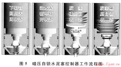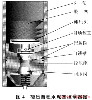 將“碰壓自鎖水泥塞控制器”連接于套管串,位于設(shè)計水泥塞高度位置,在入井過程中控制回壓,防止井內(nèi)鉆井液倒流和井口噴鉆井液,同時可減輕下套管負(fù)荷。當(dāng)固井施工注完水泥時,在井口釋放碰壓膠塞,替鉆井液使碰壓膠塞到達控壓器,形成碰壓、自鎖、密封,完成碰壓和回壓的雙重控制,防止“水泥漿替空”和“水泥漿倒流”,可有效地控制水泥