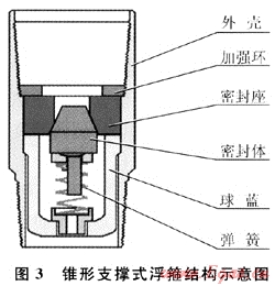 支撐式浮箍主要由外殼、加強環(huán)、密封座、球形密封體或錐形密封體、彈簧和球藍等構(gòu)成(圖2、圖3)。其特點在于所用球形密封體或錐形密封體在彈簧的支撐作用下,能夠與密封座相吻合形成密封缶構(gòu),在靜止?fàn)顟B(tài)和受反向回壓時保持關(guān)閉密封狀態(tài);在正循環(huán)時,可通過壓縮彈簧使密封體與密封座分離打開循環(huán)通道,保持循環(huán)暢通。當(dāng)彈簧在井下工作的時間較長,反復(fù)壓縮次數(shù)多時有可能產(chǎn)生疲勞,所以對彈簧質(zhì)量要求較高。球形密封體表層膠皮具有良好的補償性,但膠皮容易損壞甚至脫落,錐形密封體耐磨性較好不容易損壞。球形密封體或錐形密封體在受彈簧支撐的同時,自由度也受到一定的限制,較容易發(fā)生異物阻卡而影響關(guān)閉效果。