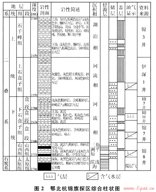 石炭系太原組和二疊系山西組發(fā)育的煤層、暗色泥巖及碳質(zhì)泥巖可以作為本區(qū)良好的烴源巖,這2組地層中發(fā)育的砂體與石盒子組砂體、泥巖一起構(gòu)成了本區(qū)油氣儲(chǔ)集層和封蓋層(圖2)。