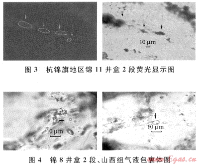 測(cè)試結(jié)果表明,包裹體絕大多數(shù)屬于氣液兩相包裹體,個(gè)別探井存在含油包裹體,顯微鏡下有明顯的熒光現(xiàn)象(圖3)。宿主礦物為石英,一般在裂縫中成串分布(圖4),形態(tài)不規(guī)則,大小為2~4μm,氣液比較低,一般在5%左右,包裹體顏色主要呈黑色或無(wú)色(占絕對(duì)優(yōu)勢(shì))。包裹體鹽度基本上反映了地質(zhì)歷史時(shí)期包裹體形成時(shí)水介質(zhì)的含鹽度。本區(qū)上古生界古鹽度分布在0~8%,表明當(dāng)時(shí)研究區(qū)沉積水古鹽度比較淡,屬于潮濕環(huán)境。