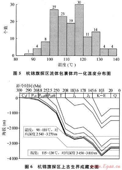 通過(guò)對(duì)6口探井的包裹體測(cè)試結(jié)果分析統(tǒng)計(jì),研究區(qū)上古生界包裹體均一化溫度區(qū)間為85~140℃,其中絕大部分?jǐn)?shù)值分布在90~130℃。在這個(gè)范圍內(nèi),均一化溫度又可分為2個(gè)區(qū)間(90~110℃和115~130℃)(圖5),表明上古生界可能至少存在2期油氣充注。根據(jù)對(duì)研究區(qū)上古生界古地溫史和埋藏史分析,古地表溫度取20℃,古地溫梯度取2.7℃/100m,分別計(jì)算2組包裹體對(duì)應(yīng)的深度2540~3270m和3454~3810m。其對(duì)應(yīng)的油氣大規(guī)模運(yùn)移期分別為中-晚侏羅世和早白堊世末-至今(圖6)。該結(jié)果與研究區(qū)烴源巖生烴模擬結(jié)果相匹配且與圈閉形成期不沖突,表明計(jì)算結(jié)果合理。