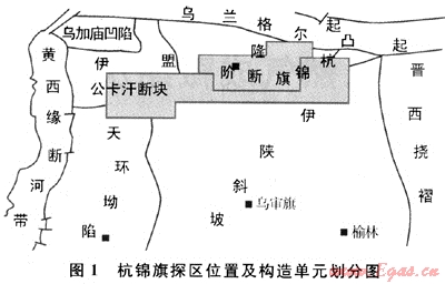 杭錦旗探區(qū)(包括杭錦旗區(qū)塊和杭南區(qū)塊)位于鄂北,橫跨伊盟隆起和伊陜斜坡兩大一級(jí)構(gòu)造單元,總面積為9825km2。根據(jù)基底頂面起伏、蓋層發(fā)育情況以及構(gòu)造形態(tài)特征,該區(qū)又可劃分為烏蘭格爾凸起、公卡漢凸起、杭錦旗斷階、伊陜斜坡及天環(huán)向斜一角等5個(gè)次一級(jí)構(gòu)造單元(圖1)[20~21]。在地形特征上,杭錦旗探區(qū)是鄂北地區(qū)長(zhǎng)期繼承性古隆起,被認(rèn)為是鄂北油氣運(yùn)移的有利區(qū)。