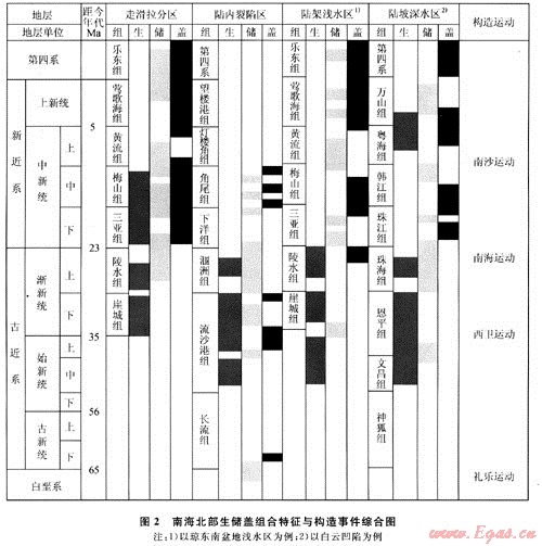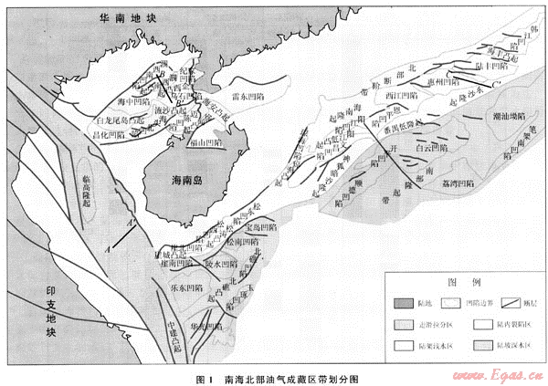 系指北部灣盆地,位于華南板塊南緣,疊置于古生界粵桂隆起區(qū)和中生界海南隆起區(qū)基底之上。古近紀(jì),在區(qū)域張應(yīng)力作用下,產(chǎn)生一系列北東-南西向和近東西向的基底大斷裂,形成眾多半地塹、地塹和地壘構(gòu)造;新近紀(jì)開始則產(chǎn)生裂后沉降,形成統(tǒng)一的中深邊淺的整體海相坳陷沉積。以區(qū)域不整合面為界,劃分為古近系陸相斷陷和新近系裂后海相坳陷2大構(gòu)造層系,以陸相沉積為主,其上披覆的海相層序較薄。