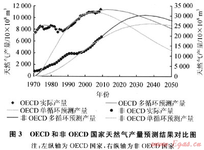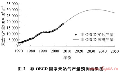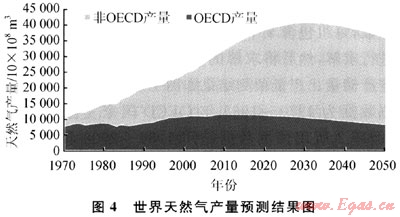 通過預(yù)測(cè),世界天然氣產(chǎn)量峰值將于2031年左右到來,峰值產(chǎn)量約為4.04×1012m3,最終可采儲(chǔ)量約為395.21×1012m3。同時(shí),對(duì)比0ECD國(guó)家與非OECD國(guó)家的產(chǎn)量曲線可以看出,0ECD國(guó)家未來的產(chǎn)量增長(zhǎng)空間較小,到2013年后產(chǎn)量將逐漸減??;而非OECD國(guó)家產(chǎn)量增長(zhǎng)空間較大。因此,我國(guó)在確定天然氣發(fā)展戰(zhàn)略時(shí),應(yīng)將非0ECD國(guó)家列為主要戰(zhàn)略合作國(guó),及早加強(qiáng)合作。