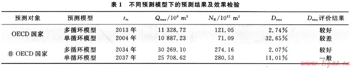 為了說明多循環(huán)模型在預(yù)測(cè)產(chǎn)量方面的比較優(yōu)勢(shì),運(yùn)用單循環(huán)廣義翁氏模型對(duì)0ECD國(guó)家和非OECD國(guó)家天然氣產(chǎn)量進(jìn)行預(yù)測(cè),將其與多循環(huán)廣義翁氏模型的預(yù)測(cè)結(jié)果進(jìn)行對(duì)比,見圖3和表1。