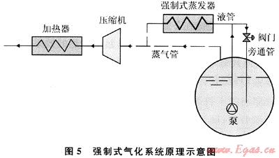 為了提高LNG船的氣化效率,在一個(gè)富有彈性的范圍內(nèi)提供更多的天然氣,可以在LNG船上考慮設(shè)計(jì)強(qiáng)制氣化系統(tǒng)。強(qiáng)制氣化系統(tǒng)主要包括加熱器、壓縮機(jī)、強(qiáng)制式蒸發(fā)器、閥門、水泵(液貨艙內(nèi))以及一些附屬設(shè)備等。相關(guān)原理如圖5所示。