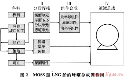 MOSS型LNG船的球罐采用鋁合金制成,板材的厚度按照不同的部位大致取值在30~170nm。為達(dá)到理想的保溫作用,鋁合金球的外表覆蓋著一層厚厚的泡沫絕緣材料,同時(shí)為了保護(hù)絕緣材料,整個(gè)貨艙球的最外表面是保護(hù)型金屬外殼。大型球罐的制造工藝流程分為備材、分段焊接、組件合成和液罐總成4個(gè)部分,詳見圖2。