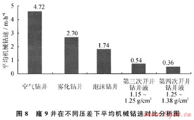 窿9井在鉆井過程中遇到各種井下復雜事故,該口井采用了氣體、霧化、泡沫以及鉆井液鉆井方式[7]?,F(xiàn)場實踐表明,井底壓差越小,則機械鉆速越大(圖8)。因此,鉆前需要認真研究該區(qū)塊的地質(zhì)特征以及分析工程難點,評價該區(qū)塊的油、氣、水分布特點和井壁穩(wěn)定性效果,然后結(jié)合具體的鉆井方式計算合理的井底壓差來達到提速增效的目標。