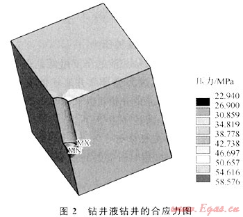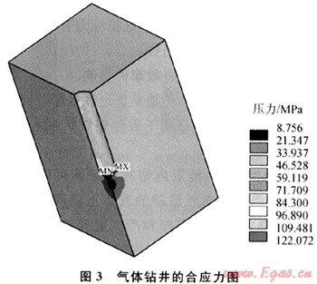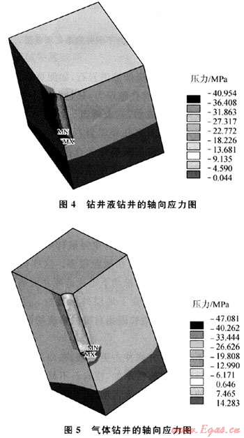 用ANSYS有限元軟件模擬了井深3000m鉆井液鉆井和氣體鉆井的地層地應力(規(guī)定拉應力為正,壓應力為負),從圖2、3可以看出,氣體鉆井時井底巖石應力值比鉆井液鉆井時井底巖石的應力值要小很多,比如圖3中氣體鉆井時井底巖石的應力最小值只有8.756MPa,而鉆井液鉆井時,井底巖石的應力最小值約22.94MPa。根據(jù)第四強度理論得到的氣體鉆井時井底巖石是處于低應力狀態(tài),此條件下的巖石的強度和塑性均比較小,比較容易破壞。從圖4、5分析垂直于井底方向的應力,鉆井液鉆井時井底為壓應力,氣體鉆井時,井底巖石受到沿井眼軸向向上的拉應力,井底中心的拉應力大小為14.28MPa,逐漸向外圍擴大,井壁處的拉應力為0.647MPa。這拉應力有“拉斷巖石,使井底巖石跳離井底”的趨勢。