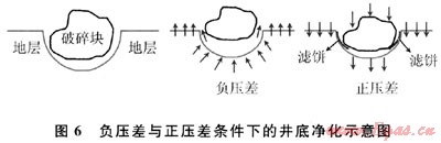對滲透性地層,地層內(nèi)飽和的流體可以流動(圖6)。負壓差條件下向外流動的流體將破碎巖屑浮起,推離井底,避免了重復破碎和產(chǎn)生更多的微粒。在正壓差條件下,正壓差下向地層內(nèi)的滲流失水,首先將巖屑壓在井底,之后迅速形成淺層濾餅,不但將巖屑緊緊壓在井底,造成巖屑的二次破碎,而且造成液柱壓力與孔隙壓力之差值集中作用于井底薄層,形成該層的集中應力。