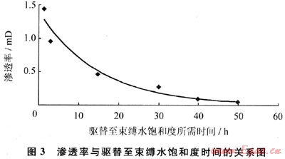 以氣驅(qū)水1h為例,驅(qū)替1h后,儲層滲透率越低,含水飽和度就越高,由此造成的暫時性水鎖損害越強(圖2),當(dāng)滲透率從1.5mD降到0.04mD時,儲層滲透率損害率從17%增加到近90%。隨著驅(qū)替時間的增長,含水飽和度會逐漸降低,當(dāng)驅(qū)替至束縛水飽和度時,暫時性水鎖完全解除。在驅(qū)替壓差及流體性質(zhì)一定的情況下,解除暫時性水鎖所需時間與儲層滲透率密切相關(guān),儲層滲透率越低,所用時間越長(圖3);當(dāng)滲透率從1.5mD降到0.04mD時,驅(qū)替至束縛水飽和度時所用時間從1.5增加到50h,表明儲層滲透率越低,暫時性水鎖越難解除。地層條件下所能提供的最大壓降要比實驗室所用的壓差小得多,且實驗室用的是干氮氣,因此在地層條件下天然氣反排外來工作液至束縛水飽和度所需時間比實驗室長得多,其時間長短與儲層滲透率有關(guān)。
