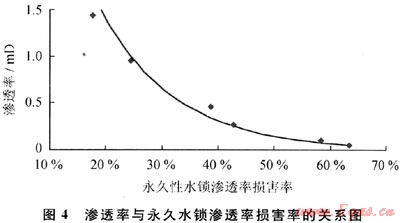 天然氣反排外來工作液降到束縛水飽和度后就再也不能降低了,由于儲層原始含水飽和度低于束縛水飽和度,這樣就有一部分水鎖永遠(yuǎn)不能解除。永久性水鎖滲透率損害率與儲層滲透率密切相關(guān),儲層滲透率越低,束縛水飽和度與原始含水飽和度差值越大(表1、圖1),永久性水鎖滲透率損害率也越強(圖4)。當(dāng)滲透率從1.5mD降到0.04mD時,永久性水鎖滲透率損害率從17.75%增至63.33%。
